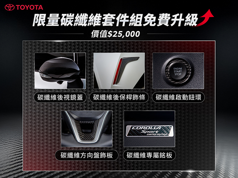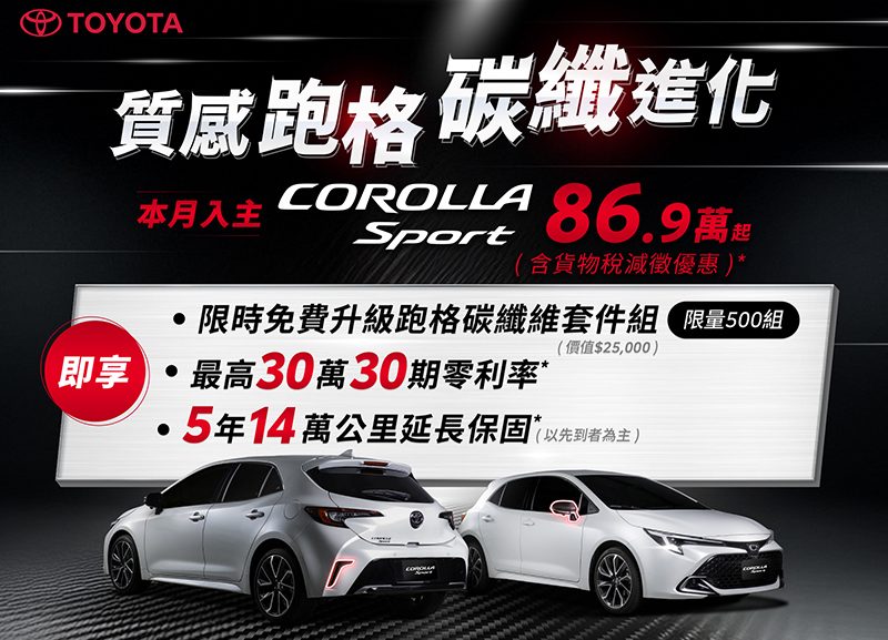 註1:本活動之適用對象為於2025/10/1-2025/10/31期間內購買COROLLA SPORT者,即可免費安裝碳纖維套件組:(1)碳纖維後視鏡蓋 (2)碳纖維後保桿飾條 (3)碳纖維啟動鈕環 (4)碳纖維方向盤飾板 (5)碳纖維專屬銘板。限量500組,送完為止。前述贈品以實物為準且須於交車時同時搭載,恕不接受更換退費、折抵現金或自行攜回。安裝碳纖維套件組者,不需額外支付安裝費用,並將由原購車經銷商提供安裝及保固服務,保固期限為自交車日起4年或120,000公里以內(以先到者為準)。前述贈品均有作動限制,且與新車保固內容不同,贈品詳細保固內容、使用說明及限制請洽原購車經銷商了解使用手冊及相關公吿説明。任何贈品使用及保固相關疑問,請逕洽原購車經銷商,和泰汽車不負任何贈品擔保責任。本活動不適用租賃、政府機關、專案批/標購者及營業車。
