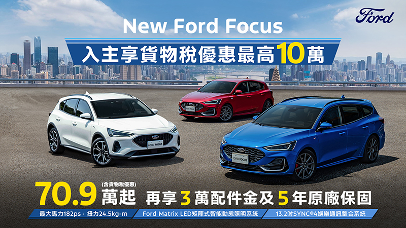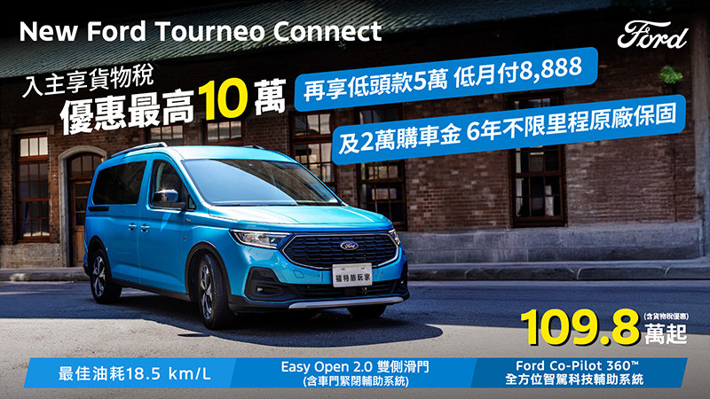 - Ford指定車款享貨物稅減徵最高10萬元,係指New Ford Focus國產全車系、New Ford Tourneo Connect福特旅玩家全車系、The All-New Ford Tourneo Custom福特旅行家全車系,享新制貨物稅減徵優惠,最高補助10萬元。
