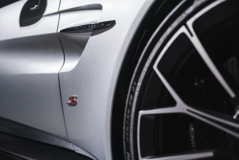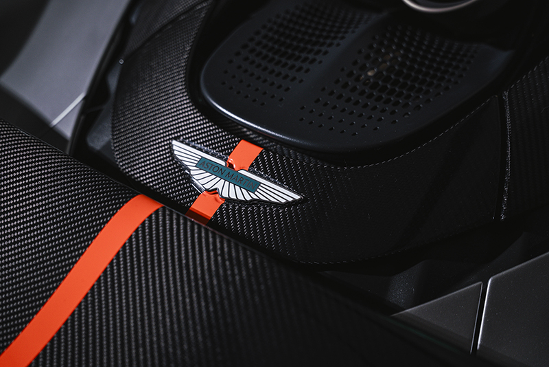 車側專屬「S」字樣以低調內斂的黃銅鑄造徽飾呈現,紅色區域採用琺瑯工藝填色,並搭配亮面或深色鍍鉻外框,與 Aston Martin 廠徽配色相互呼應,同樣由伯明罕兩百年珠寶品牌 Vaughtons 打造,細節質感宛如高級珠寶,凸顯性能特仕版本的獨到品味。