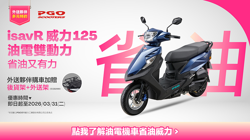 普發一萬元怎麼花最有感?PGO 給外送族最直接的答案:換一台油電車更省、還能賺!PGO 宣布推出「外送族加碼專案」,凡購買全國第一輛油電車 PGO 威力125,除可享普發現金放大與多項購車補助,外送員再加碼贈送「原廠後貨架組」,省油、能載、耐跑,一次滿足外送工作者最核心需求,威力125絕對是最聰明的升級好選擇。