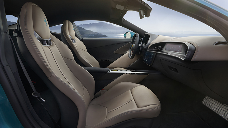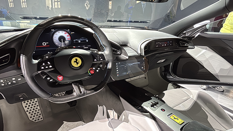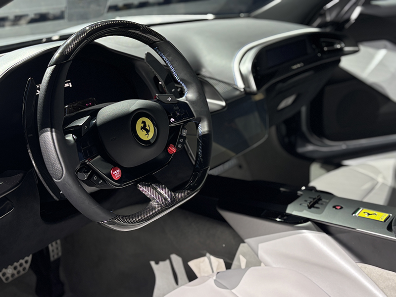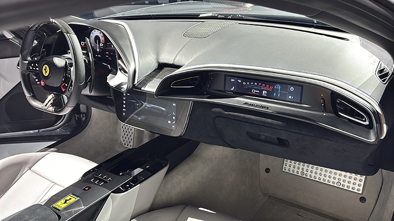 進入座艙內裝,Ferrari Amalfi 延續雙座艙配置,搭載配備實體按鍵的全新方向盤設計,左側標誌性鋁製啟動按鈕的經典回歸,重現更具觸覺回饋的操控手感。整合式中央顯示螢幕與空調出風口完美融合,以簡潔流暢的造型語彙呈現一體式視覺結構,中央鞍座更巧妙地融入換檔結構、鑰匙插槽、無線充電板及其他輔助控制功能,兼顧實用性與洗鍊設計感。