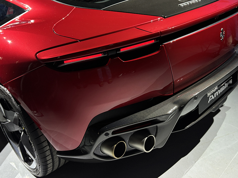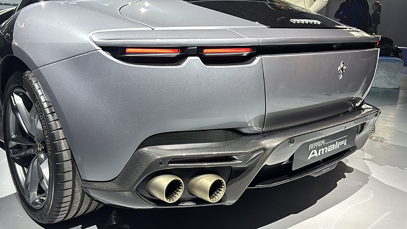 在外型設計上,作為 Ferrari Roma 的繼任車型,Ferrari Amalfi重新詮釋 V8 2+ 硬頂 Berlinetta 車型的經典設計理念,巧妙融合傳統與創新元素的設計語彙,重塑躍馬品牌的美學標竿。以雕塑般的立體曲面勾勒出一體式流線造型,展現動感純粹的美學力量,為整車賦予蓄勢待發的動感姿態。車體造型貫徹了「化繁為簡」的設計哲學,俐落線條與幾何美感十足的輪廓相互呼應,共同描繪出極具雕塑感的流暢車身。車頭拋棄傳統格柵設計,轉而在深色凹槽上方設計同色系的懸浮式前翼,下方區域的分流器則成為車頭設計的一大亮點,不僅在視覺上延伸了車體寬度,更進一步彰顯Ferrari Amalfi的運動基因。車尾造型採用同樣的設計理念,以一條鮮明的環繞式線條包覆尾部並延伸至車側,勾勒出簡潔俐落的輪廓。尾燈巧妙隱藏在幾何切口內,以現代設計語彙向 Ferrari 經典車型致敬。此外,為彰顯獨特個性,新車同時推出全新車色「Verde Costiera」以阿瑪菲(Amalfi)海岸的粼粼波光為靈感,這抹閃耀的藍綠色調隨車體曲面流轉,不僅強化雕塑般的立體感,更為整體設計注入充滿活力的氣息。
