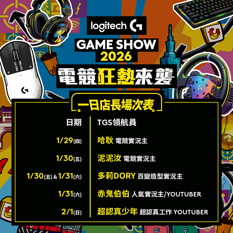 全球電競周邊領導品牌 Logitech G 宣布,將於 1 月 29 日至 2 月 1 日盛大參與 2026 台北國際電玩展(Taipei Game Show,TGS),以突破性電競科技結合極致賽車美學,打造年度最受矚目的電競競速盛會。