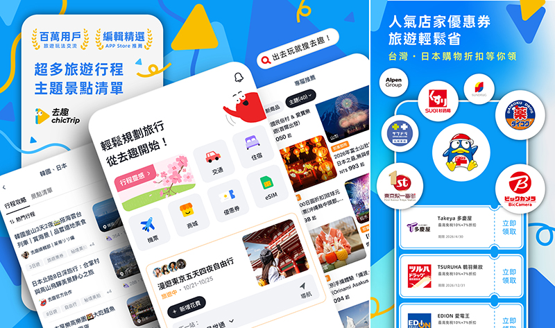 去趣chicTrip中擁有超過100萬筆以上的日本行程註1,從三天兩夜獨旅、到七天六夜的家族旅行,從美食餐廳、秘境景點到打卡熱點,多樣化的內容都是旅人的靈感,一鍵複製後便可馬上使用;去趣更從2025年初開始經營YouTube頻道,截至2026年1月已累積14萬追蹤,原創日本旅遊企劃串聯APP內規畫功能,也是你最強的旅遊玩伴。出發前更別忘記在去趣上訂購旅遊eSIM,一掃QRcode馬上就能連上網路,更搭配24小時客服服務,讓旅客在海外也能以更優惠的價格安心使用網路服務。旅途中打開去趣,更能領取豐富的日本人氣店家與熱門景點優惠券,最實用的折扣一手掌握,吃喝玩樂超划算!