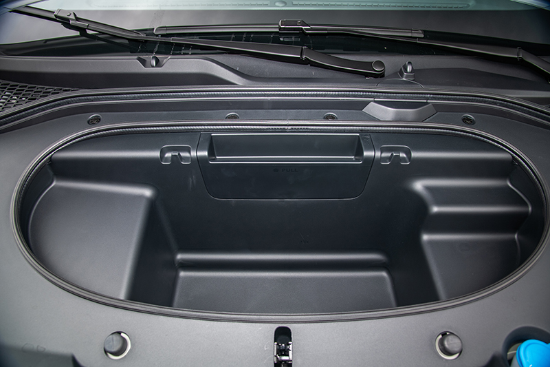 打開前蓋,52公升的前行李廂空間足夠容納一只13吋行李箱。頂規Pioneer版本採雙色塗裝,黑色車頂讓整體比例更修長,20吋低風阻輪圈與235/40 R20設定的EV專用胎,把視覺與性能一起拉高。