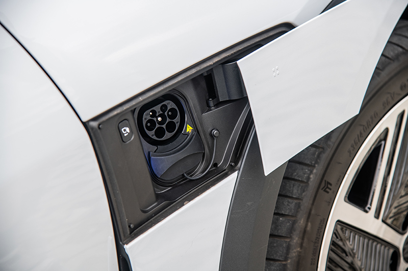 充電口位於右側,電動開關設計操作俐落。支援CCS2直流快充,最高134kW功率,10%至80%約30分鐘完成補能。V2L外放電功能則替戶外生活多開一條可能性。