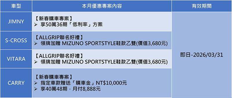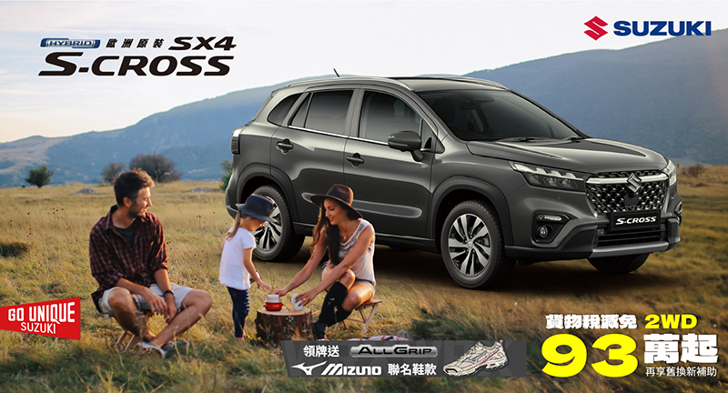 - *「SUZUKI ALLGRIPxMIZUNO 跨界聯名專案」:本活動之適用對象為於2026/03/01~2026/03/31期間內購買S-CROSS 4WD、VITARA 4WD且完成領牌者,可獲得MXR乙雙(下稱贈品),原價新台幣3680元。數量及鞋子尺寸有限,送完為止。贈品以實物為準,恕不接受更換、退費或折抵現金。兌換憑證逾期、遺失或毀損,恕不補發。任何贈品使用之相關疑問,請逕洽台灣美津濃股份有限公司客服專線:02 2509-5100詢問, TAIWAN SUZUKI或原購車經銷商不負任何贈品擔保責任。 本活動不適用租賃、政府機關、專案批/標購者及營業車。兌換時間:2026年01月25日~2026年05月31日止。