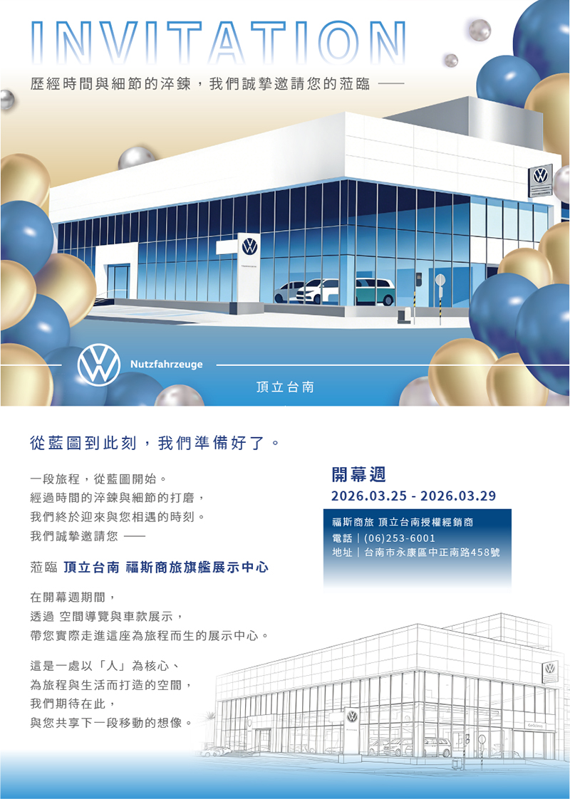 台灣福斯商旅深耕在地再創里程碑!為落實對南台灣車主的長期承諾並展現品牌轉型願景,台灣福斯商旅的經銷夥伴頂立汽車,斥資逾新台幣三億元,於台南永康傾力打造佔地 1,380 坪的全新旗艦展示中心。看準台南科學園區的潛力及在地市場的成長動能,「亞洲最大」福斯商旅旗艦展示中心於本月 25 日正式投入營運,以永續綠能建築落實企業社會責任,重新定義南台灣德國商旅車服務新標竿。