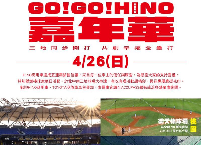 《2026 GO! GO! HINO嘉年華-棒球家庭日》將於3/25(三)17:00起開放線上ACCUPASS報名,誠摯邀請 HINO與TOYOTA商旅車車主共襄盛舉棒球家庭日應援盛事。詳細活動內容及報名方式請至HINO官網(https://www.hino.com.tw/)或粉絲專頁(https://www.facebook.com/hinotaiwan.official)查詢;或可洽和泰汽車所屬商用車經銷商-長源汽車、蘭揚汽車、東部汽車之營業據點,詢問索取門票事宜,門票數量有限,送完為止。