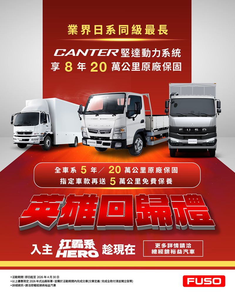 FUSO 於四月隨巡迴車展同步展開,推出【FUSO英雄回歸禮】購車雙重升級優惠。不僅提供日系品牌同級最長的原廠動力系統免費保固,亦針對指定車型推出專屬購車優惠,持續回饋車主長期支持,並以完善服務品質提升整體用車體驗。
