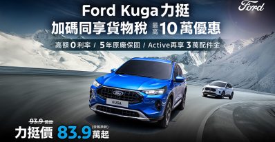 響應貨物稅減徵政策,Ford Kuga力挺價83.9萬起,再享高額零利率與原廠保固! 好試家倍!Ford指定車款享貨物稅減徵最高10萬元,試駕再送全家禮物卡